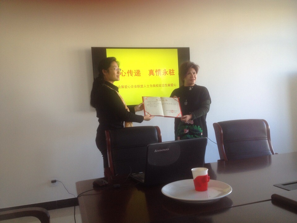 2014年11月14日上午10:00時(shí)秦皇島市如意山海拍賣有限公司、眾籌愛(ài)心企業(yè)聯(lián)盟及秦皇島市德善公益協(xié)會(huì)一行愛(ài)心人士抵達(dá)秦皇島新世紀(jì)高級(jí)中學(xué),將本次拍賣會(huì)的部分善款親手交到了貧困學(xué)子楊敬儒手中。本次活動(dòng)得到新世紀(jì)高中學(xué)校領(lǐng)導(dǎo)的高度評(píng)價(jià),隨行記者對(duì)此次活動(dòng)進(jìn)行了追蹤報(bào)道。秦皇島市如意山海拍賣有限公司總經(jīng)理張修宇表示希望楊敬儒同學(xué)能夠堅(jiān)強(qiáng)的度過(guò)暫時(shí)的難關(guān),讓愛(ài)心的陽(yáng)光照亮她年輕的生命,活出自己生命的精彩。楊敬儒表示非常感謝社會(huì)各界對(duì)自己的幫助,一定要考上理想的大學(xué),回報(bào)社會(huì)。