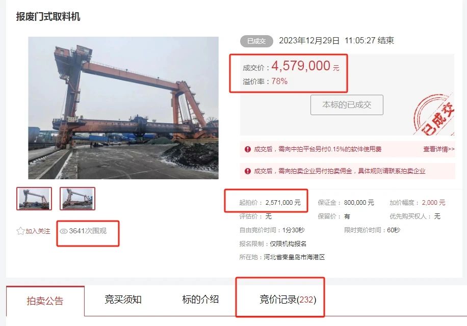 歲末年初之際,收官開局之時。2023年12月29日,我公司在中拍平臺對“報廢門式取料機”進行公開拍賣。本場拍賣會是我公司2023年最后一場拍賣會,共引來3641次圍觀、232次競價,起拍價257.1萬元,經(jīng)過一個半小時的激烈鏖戰(zhàn),最終溢價200.8萬元,以457.9萬元成交,溢價率高達78%!每一次落槌,每一次成交,都能創(chuàng)造新記錄!